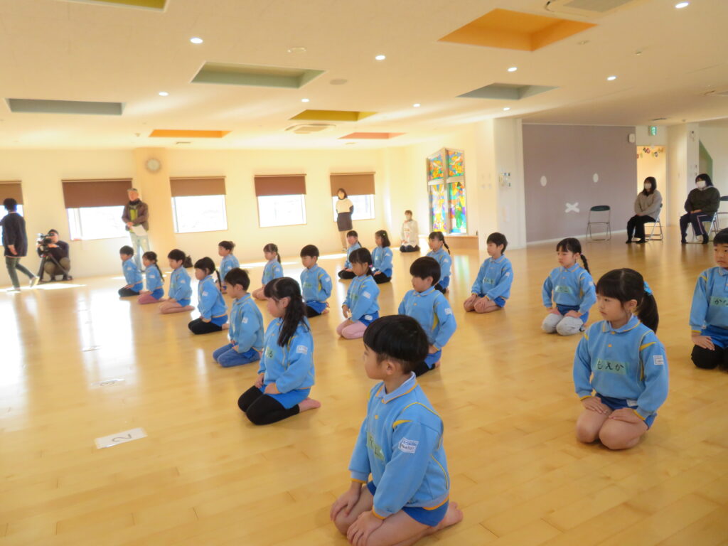 日田市剣道連盟さんのご厚意で年長組46名が、日本古来の武術、剣道体験させていただきました。剣道連盟の達人、小宇佐先生と本川先生がまずは、目にも止まらぬ俊敏な動きで、面・胴・籠手の技を大きな気合の声と共にお手本を見せてくださり、子どもたちも先生たちも大感激!思わず、「かっこいいね~」と感心いたしました。その後は、剣道の心得・残心などを、わかりやすく教えていただき、最後は子ども用の竹刀を持ちお稽古させていただきました。本当に貴重な体験ありがとうございました。