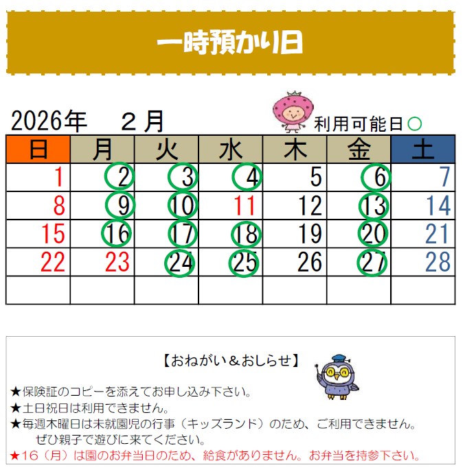 【2月】一時預かりスケジュール